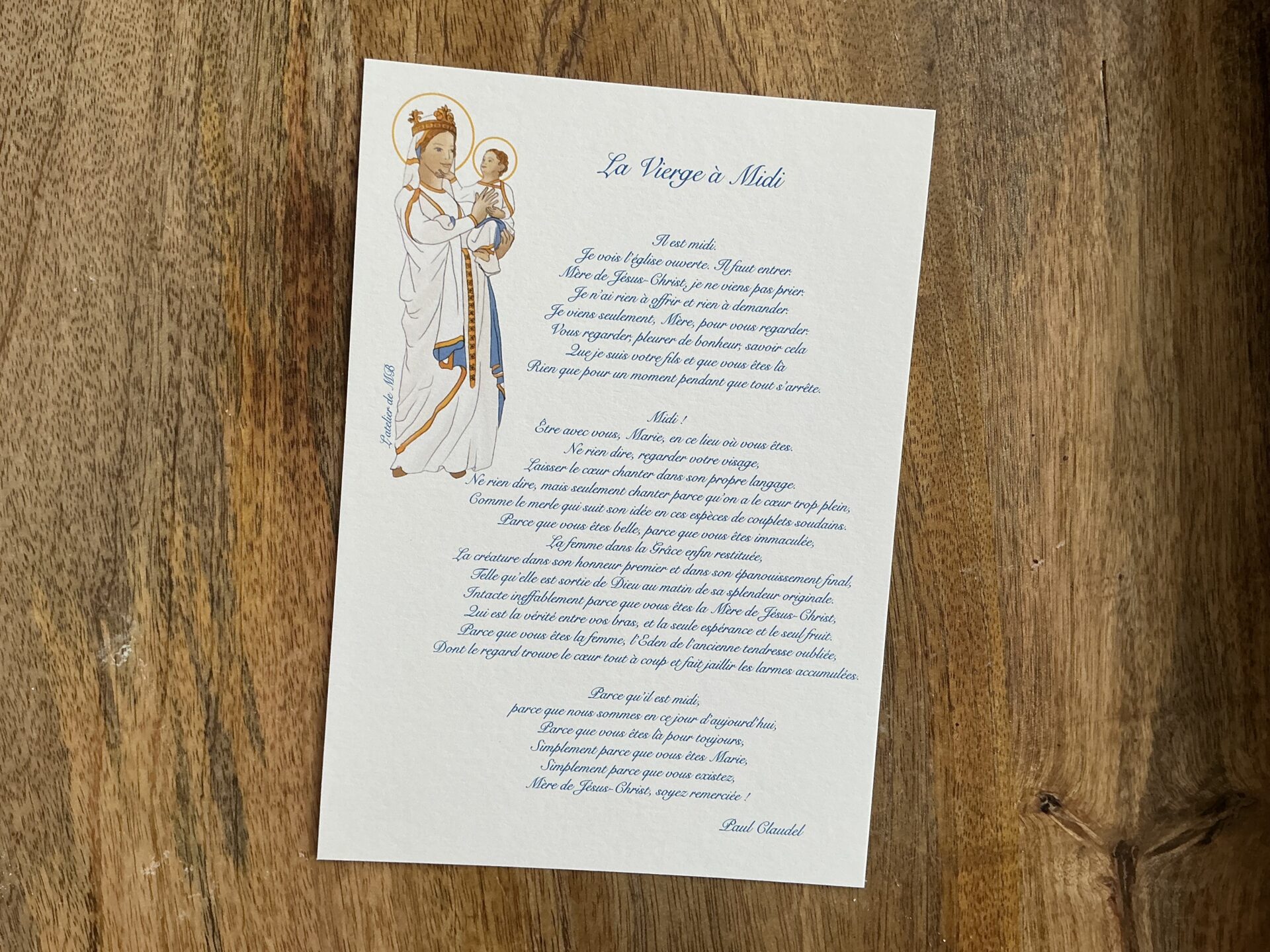 Carte au format A5 du magnifique texte de Paul Claudel, La Vierge à Midi.